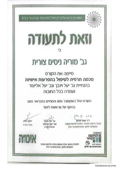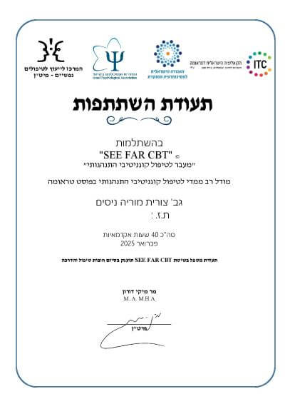 שמי צורית מוריה ניסים, ואני פסיכותרפיסטית קוגניטיבית־התנהגותית (CBT), מטפלת ב־EMDR ומטפלת במוזיקה.